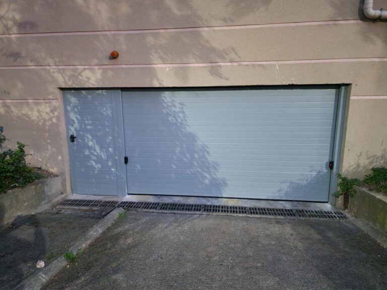 Installation d'une porte basculante non débordante et un portillon de la marque Sindaur à Marseille 13008 dans une copropriété